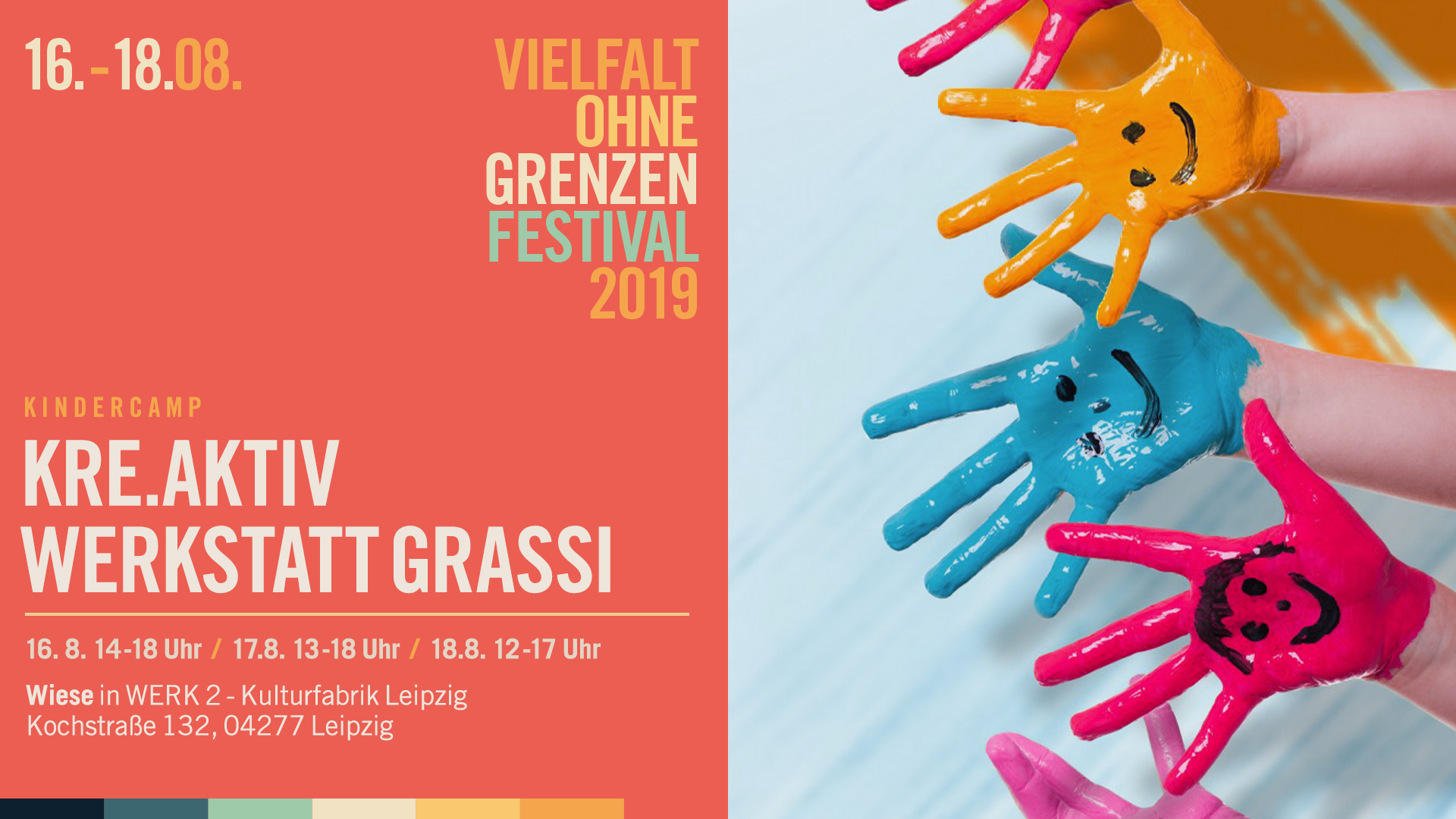 Kre.Aktiv Werkstatt GRASSI meets „Vielfalt ohne Grenzen – Festival“. Wir öffnen einen Kreativspace nur für Kids mit mehreren Ständen. Mit kreativen und entspannenden Bausteinen werden die Teilnehmer*innen für verschiedene Themen sensibilisiert (z.B. Umwelt, Nachhaltigkeit, Konsum, Fremdheit, Identität, Religion, Kulturelle Vielfalt) und lernen spielerisch durch diese Hilfsmittel der Interkulturellen Pädagogik und der Kunst– und Kulturvermittlung (z.B. Interkulturelles Training) aktiv Vielfalt kennen.