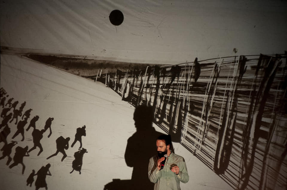 Doch mit einem Wisch ist die Ruhe und Kraft dieser Szene verschwunden, das abgebildete Land ist wieder karg, eine Menschen-Karawane zieht durchs Bild, dunkle Wolken ziehen auf. In Loops ertönt rhythmisches Keuchen mit kraftvoller Stimme. Eine neue Komposition entsteht und mit ihr eine neue Geschichte.